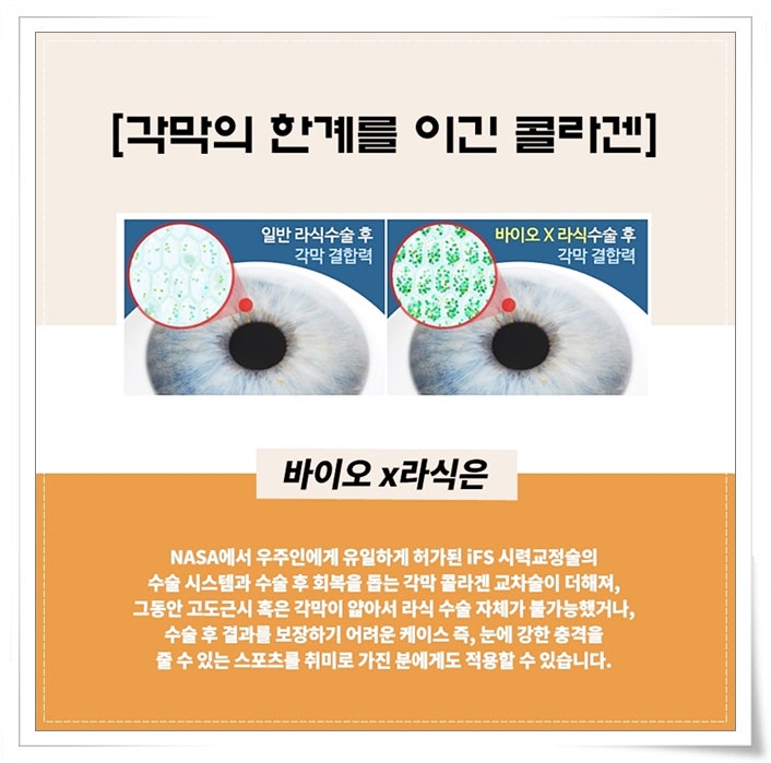 오복(五福)의 하나로 알려진 우리의 눈은 사물을 보고 판단할 수 있도록 도와주는 감사의 기관입니다. 우리 몸의 장기 중에서 특히 중요한 부분이라고 할 수 있습니다. 하지만 다양한 이유로 시력이 나빠지면 일상생활에 불편함을 느끼실 수 있습니다. 최근에는 전자기기를 사용하는 시간이 늘어남에 따라 어린 나이에도 실명하는 경우가 많아 적극적인 안과 진료가 필요합니다. 그래서 많은 사람들이 좋지 않은 시력을 교정하기 위해 안경이나 콘택트렌즈를 착용하지만 이러한 시력교정 도구는 일상생활에서 불편한 경우가 많습니다. 안경이나 콘택트렌즈를 착용하시는 분들은 시력저하로 인해 불편함을 느끼신 후 시력교정 수술을 고려하실 때 안정성이 높은 수술을 먼저 찾으십니다. 그 중에서도 라섹은 기존의 시력교정 수술 중 가장 안정적인 수술로 꼽히지만, 라섹의 통증으로 인한 진입장벽과 긴 회복기간으로 인해 성급한 결정을 내리기 어려운 경우가 여전히 많습니다. 그래서 오늘은 이 문제를 해결해주는 시력교정에 대해 이야기 해보려고 합니다.