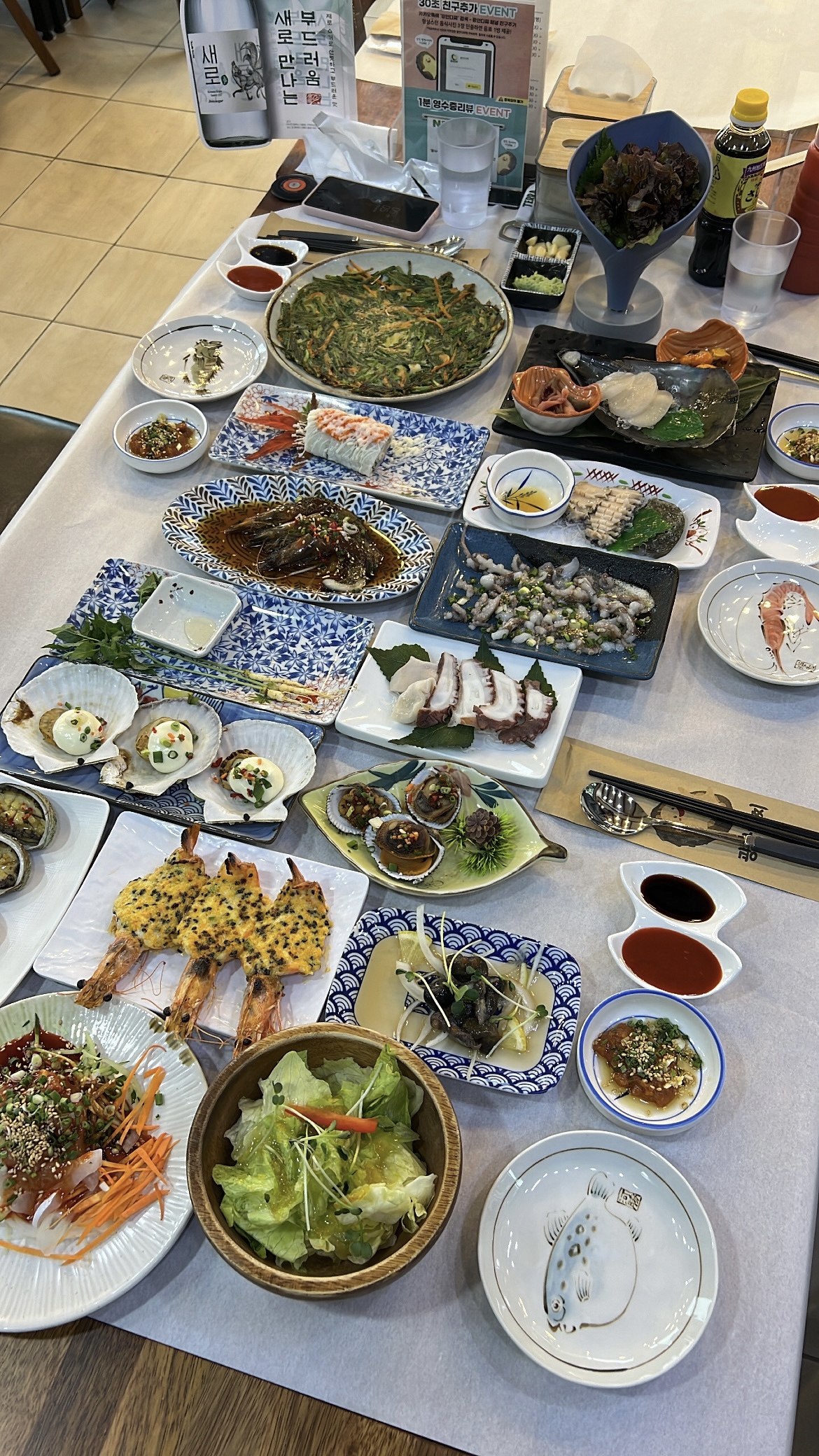 새우, 전복, 활낙지, 만두, 가리비 등등. 조금 부끄럽지만 배가 고파서 회가 나오기 전에 엄청 빨리 먹어버려서 셰프가 놀란다.