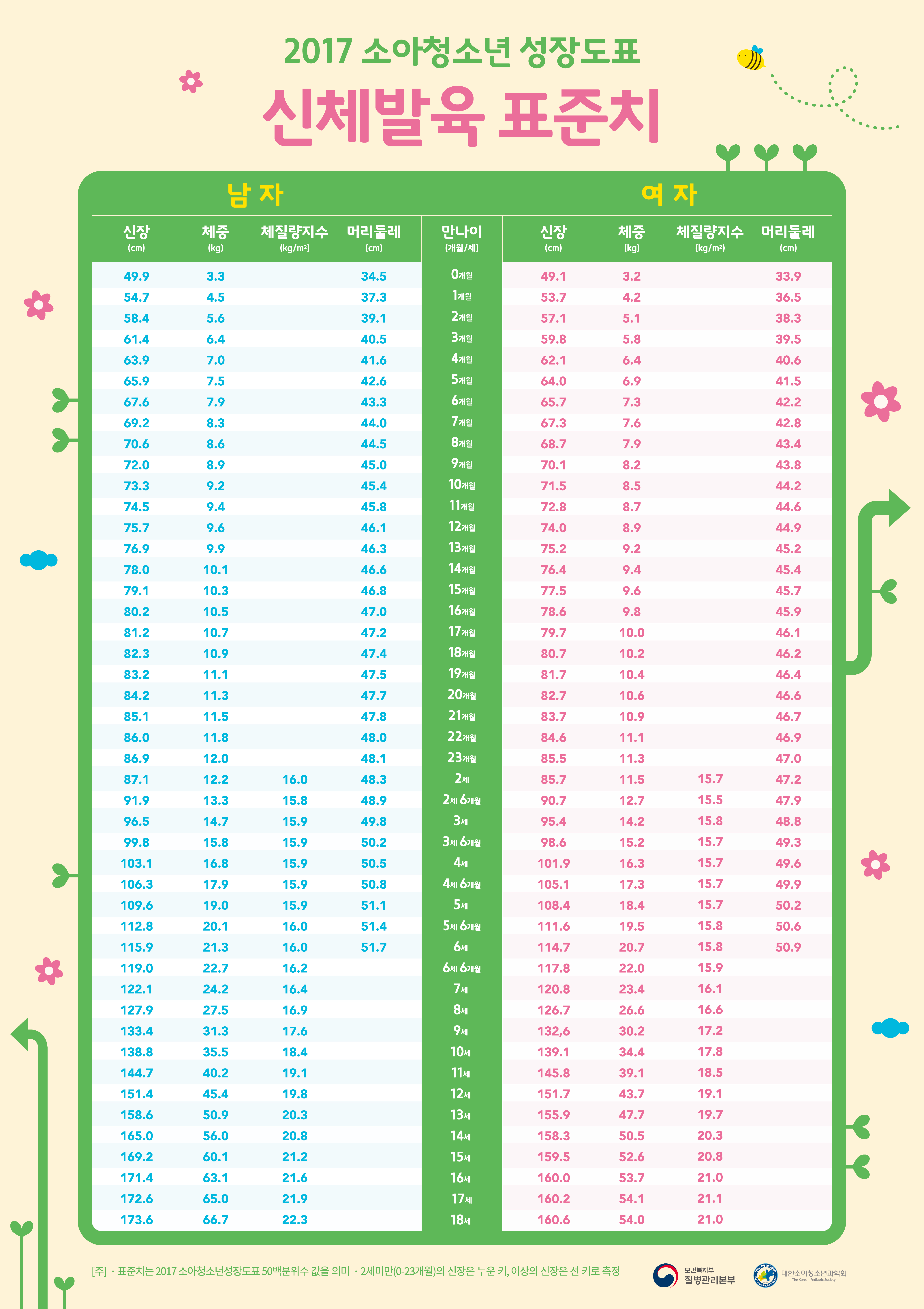 남아 개월 키(cm) 몸무게(kg) 머리둘레(cm) 0개월 49.93.33 4.5 1개월 54.74.5 3 7.3 2개월 58.45.6 3 9.13개월 6 1.46.4 4 0.5 4개월 6 3.97.0 4 1.65개월 6 5.97.5 4 2.66개월 6 7.67.9 4 3.3