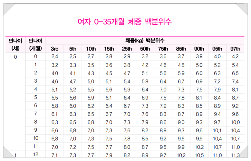 남아 개월 키(cm) 몸무게(kg) 머리둘레(cm) 0개월 49.93.33 4.5 1개월 54.74.5 3 7.3 2개월 58.45.6 3 9.13개월 6 1.46.4 4 0.5 4개월 6 3.97.0 4 1.65개월 6 5.97.5 4 2.66개월 6 7.67.9 4 3.3